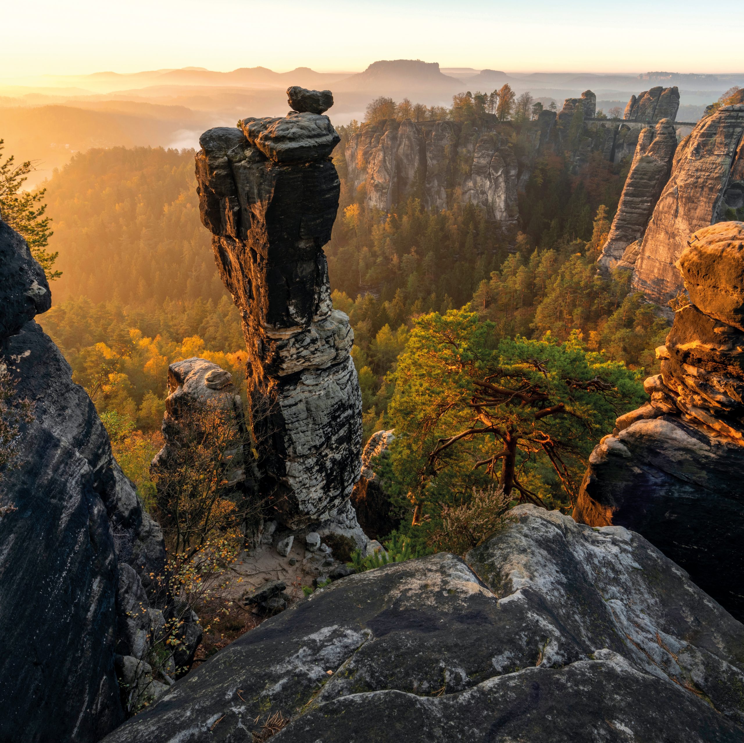 Wehlnadel mit Bastei zum Sonnenaufgang im Elbsandsteingebirge S