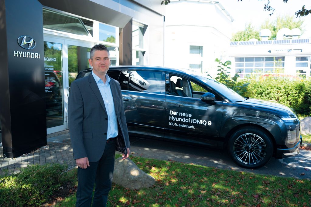 Die Kunden haben die Wahl zwischen drei Leistungsstufen: vom effizienten Frontantrieb über einen kraftvollen Allradantrieb mit 300 PS bis hin zum Performance-Modell mit über 400 PS. Damit zeigt Hyundai, dass Elektromobilität längst nicht nur auf Sparsamkeit, sondern ebenso auf Dynamik und Fahrspaß setzt. Auch beim Raumkonzept punktet der IONIQ 9: Erhältlich als Sechs- oder Siebensitzer, mit optional drehbaren »Swivel Seats« in der zweiten Reihe, bietet er Businesskomfort, wie man ihn sonst eher aus der Luxusklasse kennt. »Das macht das Auto zu einem mobilen Büro«, sagt Janik Seirig. »Gerade für Geschäftsführer, die viel unterwegs sind, ist das ein echter Mehrwert.«