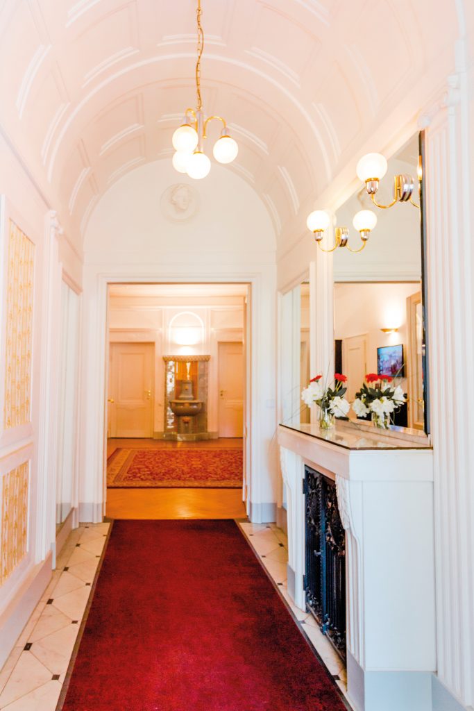 Schon beim ersten Blick verzaubert die Villa mit ihrer eleganten Fassade und dem parkartigen Garten. Doch erst im Inneren offenbart sich die wahre Pracht: Stuckdecken, die wie kunstvolle Spitze wirken, Bleiglasfenster im ehemaligen Musikzimmer, durch die das Licht in sanften Farben tanzt, und in der Lobby ein über hundertjähriger Wandbrunnen aus Original Meissner Keramik, dessen leises Wasserrauschen die Atmosphäre vergangener Zeiten heraufbeschwört.